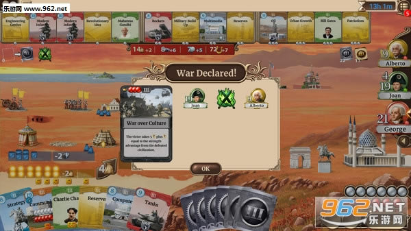 当然你很可能还没货到近代就GG了,游戏共分为4个时代,在这个过程中玩家要关注军事、政体、文化、人口、粮食、矿石、科技和人民满意度等各个方面,保证在游戏结束时的点数比对方高。