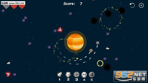 这款游戏说起来其实是一个非常简单的游戏,但是需要有一定的操作力和预判能力,我们需要控制一颗卫星阻止宇宙中的陨石和外星的飞船对我们所保护的星球产生伤害,一般的模式中星球有3滴血,每一次攻击成功扣除一滴血量,当然游戏中还有一些buff道具!我们也可以控制星球发出导弹对无法兼顾到的敌方单位进行攻击~