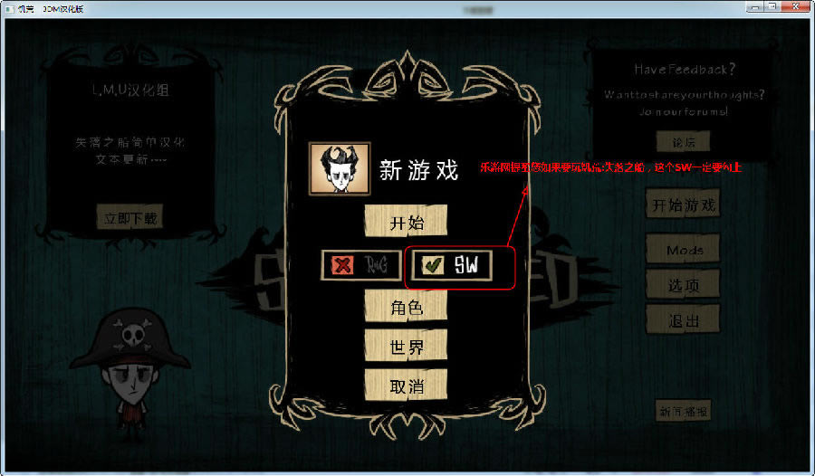 如果要玩饥荒:失落之船,请在下面的位置勾选上“SW”,默认是没有勾选的。