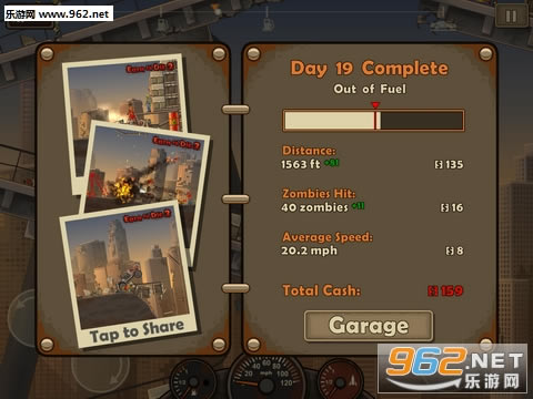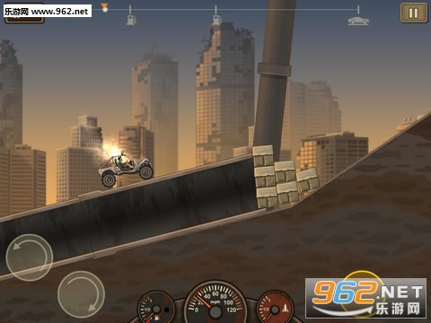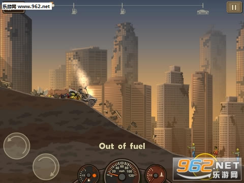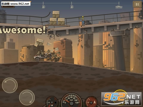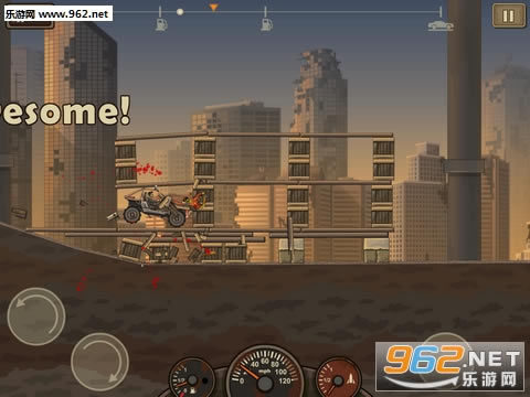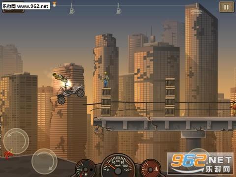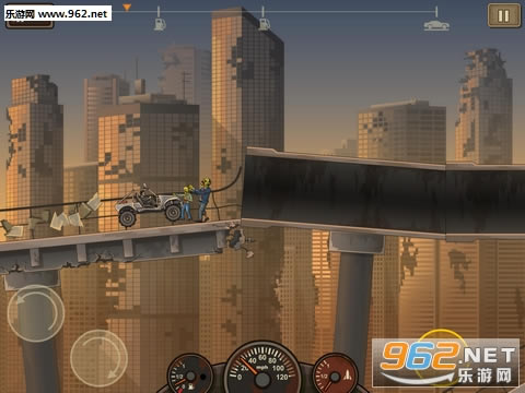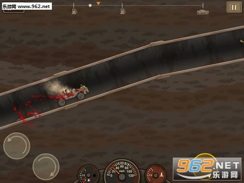 操作方式也比较的简单,若是玩过一些越野赛车游戏,想必玩家更能明白游戏其中的要素。游戏是以虚拟按键进行控制,共三个按键,分别为控制车头抬起的上升键和车头低下的下降键,此外还有游戏中最重要的加速键,可以说玩家全程都必须按着加速让车子狂飙。而整个场景的道路会遍布各种障碍物与僵尸,它们都会对车辆造成一定的减速,若是一口气到不了终点多半是因为速度冲不起来造成的,因此玩家撞向障碍物是尽可能找薄弱的位置撞去,而僵尸在没有武器的情况下则尽可能的把车头抬起将其碾压,若是直接撞上不但会造成减速,僵尸还会挂在车上提升车子的重量。