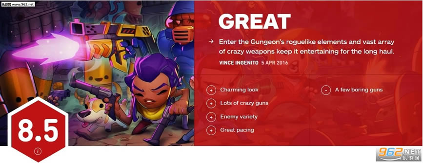 《挺进地牢》以使用各种各样的枪械击爽快的击杀怪物为卖点,游戏收录了200种以上的枪。每次挺进地牢的深处,游戏的难度都会加大,然而乐趣也随之提升。在这款游戏中进行数十小时的游玩也依然其乐无穷。IGN给出了8.5分。