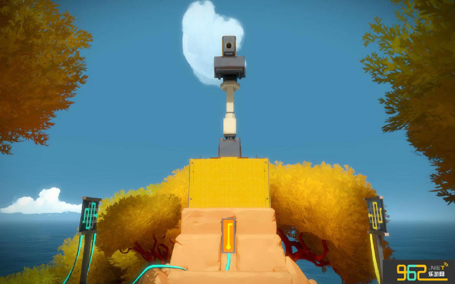 从进入游戏后就能感受到本作清新柔和的画风,精致的画面毋庸置疑的是本作一个好评的地方,《见证者》尽可能的为玩家展示了一座风景如画的小岛景色。如镜面一般分割开来的山水。残破未知的古堡小镇,迷人的火红色枫叶林。玩家可以自由的在岛上探索,从自己想要感兴趣的地方下手解谜。