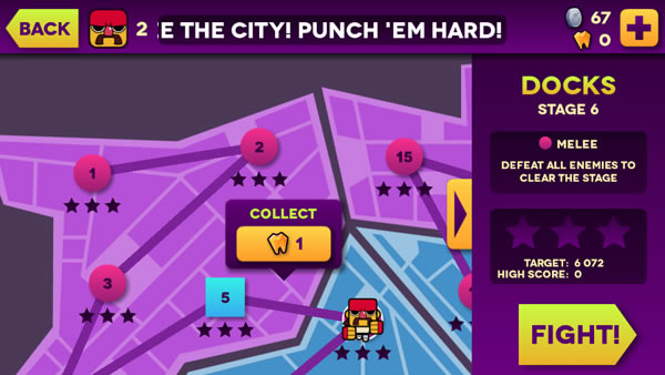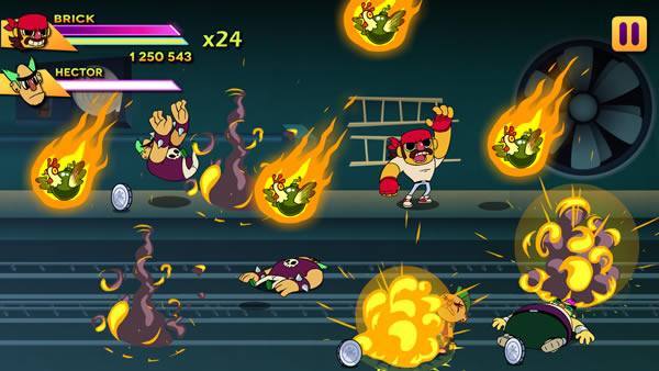 具体到 《超级街战 Big Action Mega Fight!》 ,也算是动作类游戏当中使用手势动作较多的。移动方面,玩家只需点击屏幕任意位置,小胡子叔叔将四处滚来滚去,这个行进方式算是比较新颖,就制敌而言,算是比较有用。而攻击方面,左/右划屏代表向左/右攻击,这个设定有小小扣分,该动作使用起来不太直接,会减少游戏的击打感。另外的一些诸如画圈、双指等手 势也都各有千秋,玩家可以自行感受。