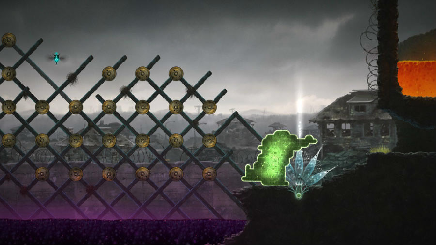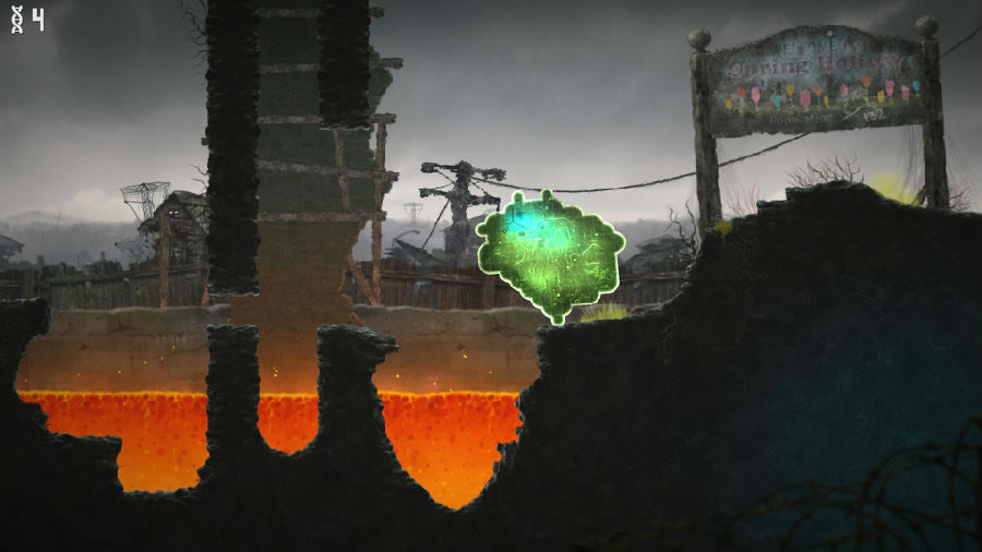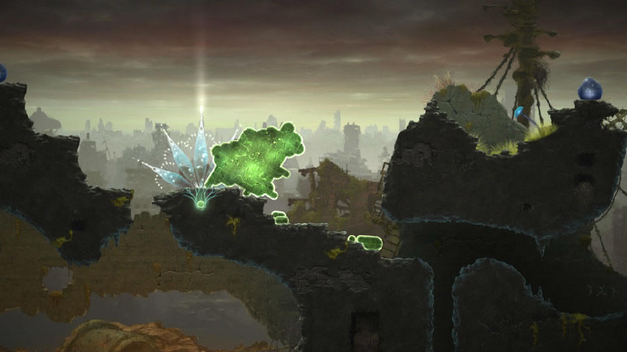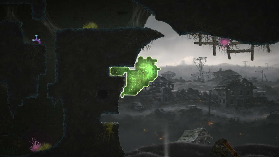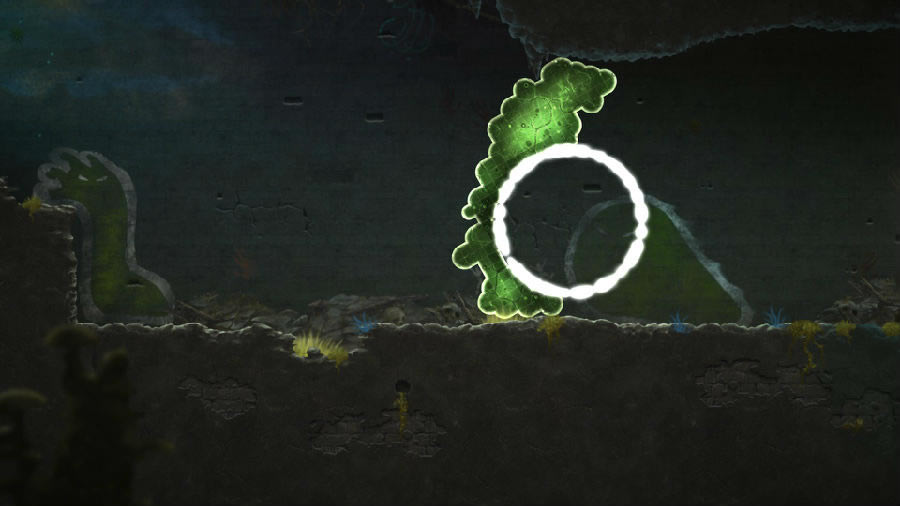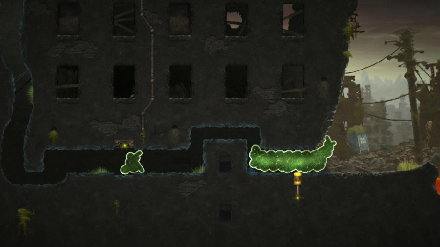例如在第二关中需要爬上一个非常高的悬崖。按照传统的解谜游戏思路来思考的话,就会想方设法地寻找电梯,或者隐藏的小道——毕竟正常的人是不可能直接爬上那么高的地方嘛。但是这款游戏的主角并不是一般人,充分利用它的“质量守恒”特性,真的就能直接爬上去。这个悬崖每隔一段距离都有一个非常小的凹痕,因此我们只需要像挤牙膏一样把这坨翔的一小部分挤进去,再把地面上剩余的大部分身体全部摧毁,一切就迎刃而解了。在“质量守恒”规则的作用下,凹痕处的那一小部分会生长成完整的一部分,接下来需要做的只是重复上述动作,让这坨翔利用凹痕逐渐“生长”到最上方。