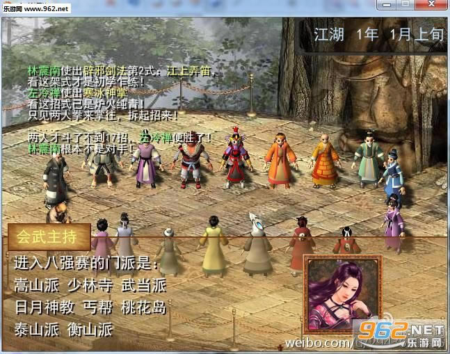除半即时战斗外,游戏还有类似MUD的文斗系统,可以单挑比剑法、比刀法、比拳法、比内功。。。战斗更为简洁,武侠人物特色更为鲜明,两年一届血脉贲张的武林比武大会,一朝成名,一统江湖!