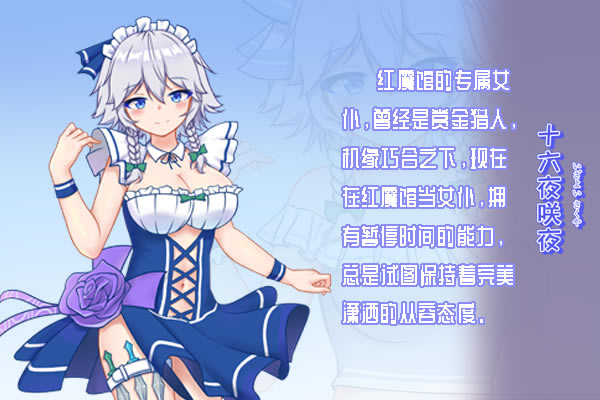 红魔馆的专属女仆,曾经是赏金猎人,机缘巧合之下,现在在红魔馆当女仆,拥有暂停时间的能力,总是试图保持着完美潇洒的从容态度。