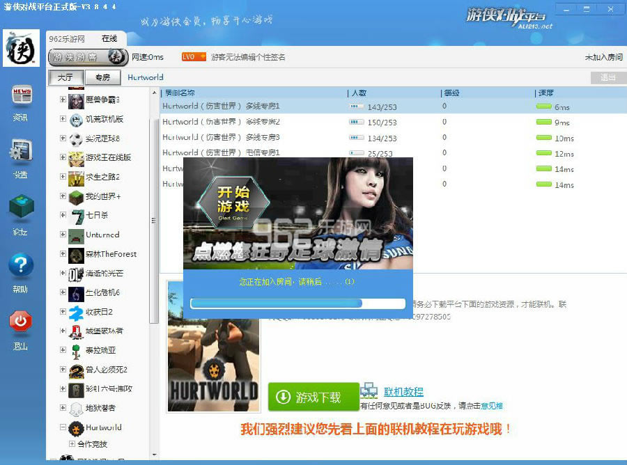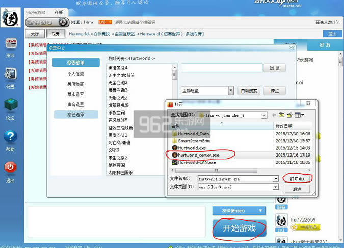 其他玩家需要从对战平台加入游戏,同样可以以游客身份登录对战平台,寻找到游戏,进入专房,点击“开始游戏”按钮,在弹出的“设置中心”界面,点击“浏览”按钮寻找游戏安装文件夹,找到Hurtworld-LAN.exe,之后点击打开,请玩家注意本路径和建立主机的所选的的主程序的路径是不同的