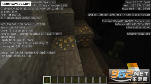 而且在平顶山群系里,稀有的矿物出现的高度增加了。比如我就在54格发现了金矿石。而且矿石的数量也有明显的增加。