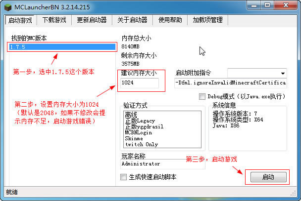 这次我的世界1.7.5启动器采用的是MCLauncherBN版的,玩家进游戏前需要进行简单的设置,具体操作方法如下: